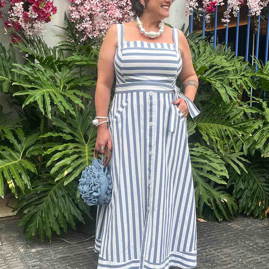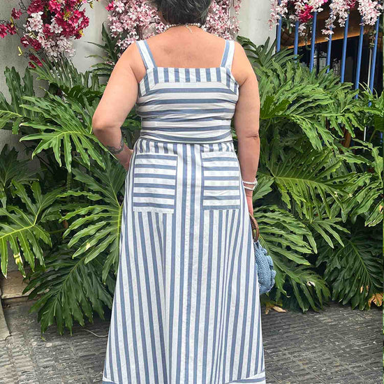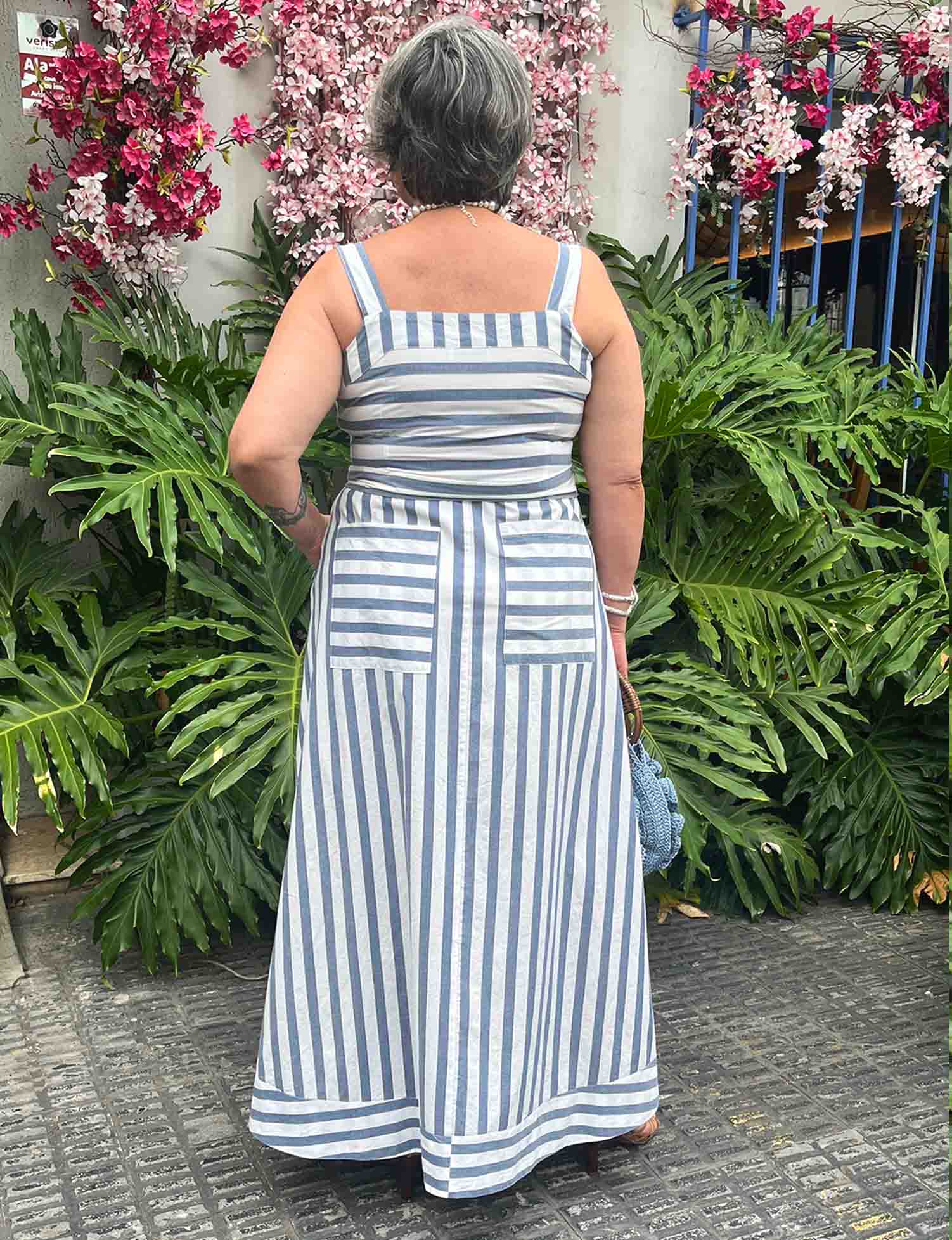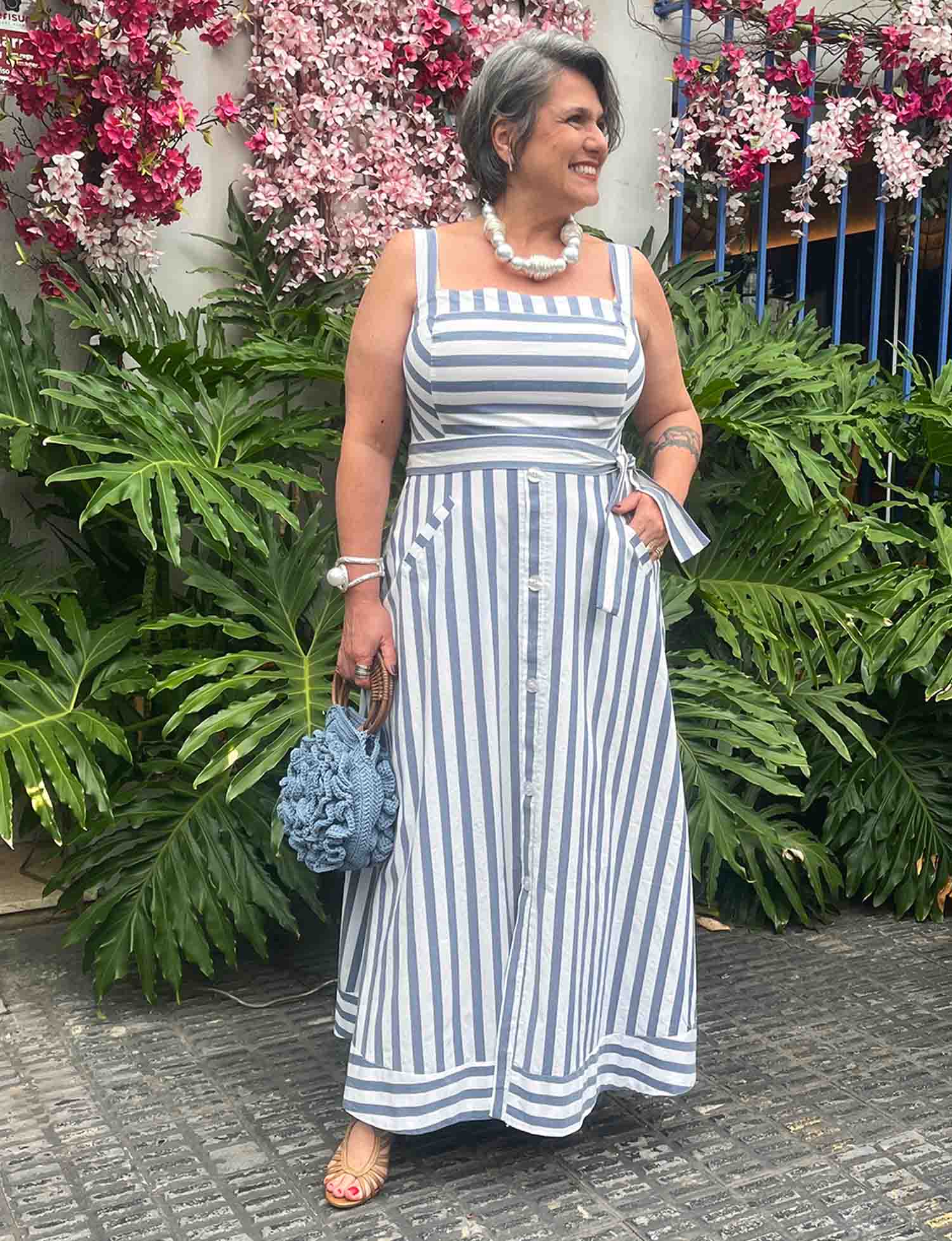 Estampa Listrada Atemporal: Clássicas listras azuis sobre fundo branco para um visual náutico chique e versátil.